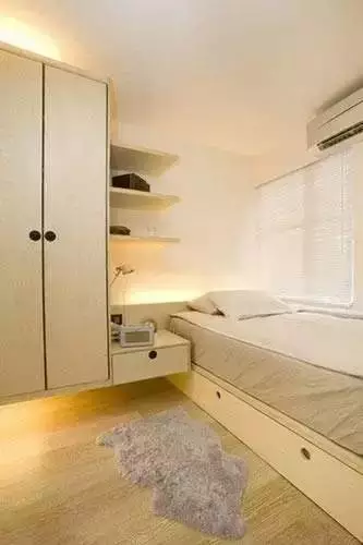 ? 家具的一物多用,是小空間最喜愛的事情。騰空床的適時加入,讓小臥室有了更多可利用的地方。床的下端多出的空間正好可以用來放置沙發,不用時收起來能釋放更多的臥室空間。